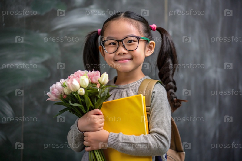 Первоклассный азиат с очками на доске. Девушка держит цветы в руках. Ребенок пойдет в школу впервые. Ребёнок с рюкзаком, книгой и цветами. Возвращение к школе