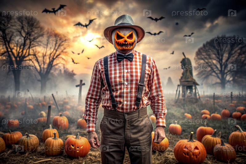 Концепция Хэллоуина. Ужасная. Страх. Устрашающий богий с тыквенной головой, квадратной рубашкой и бабочкой. Баннер, открытка