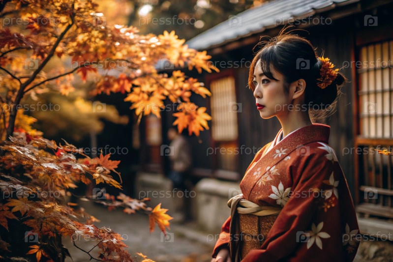 Японская девушка в традиционном национальном костюме - кимоно. На сказочном фоне фонарики и осенние деревья. Портрет символизирует традиции и культуру народа Японии