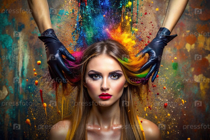 Творческий баннер для салона красоты или парикмахера. Модное профессиональное окрашивание волос. Красивая женщина с длинными многоцветными волосами. Взрыв цветов на голове