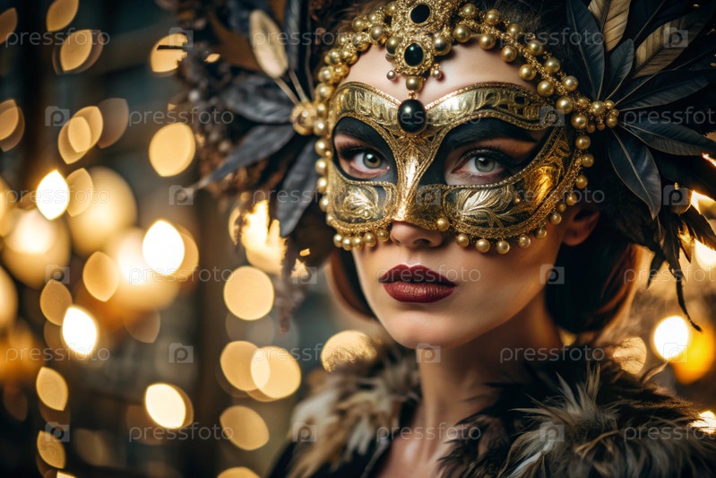 Карнавал Венеции.Закрытие женщины в украшенной карнавальной маске.Яркие цвета передают атмосферу празднования и роскоши