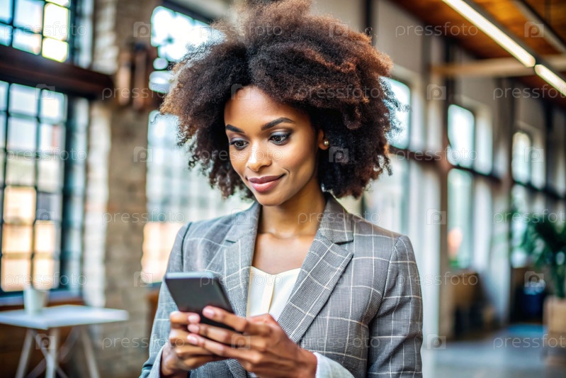 Деловая чернокожая афроамериканка с кудрявыми волосами. Она одета в простую куртку. В руках смартфон. Бизнесмен смотрит на свой мобильный телефон