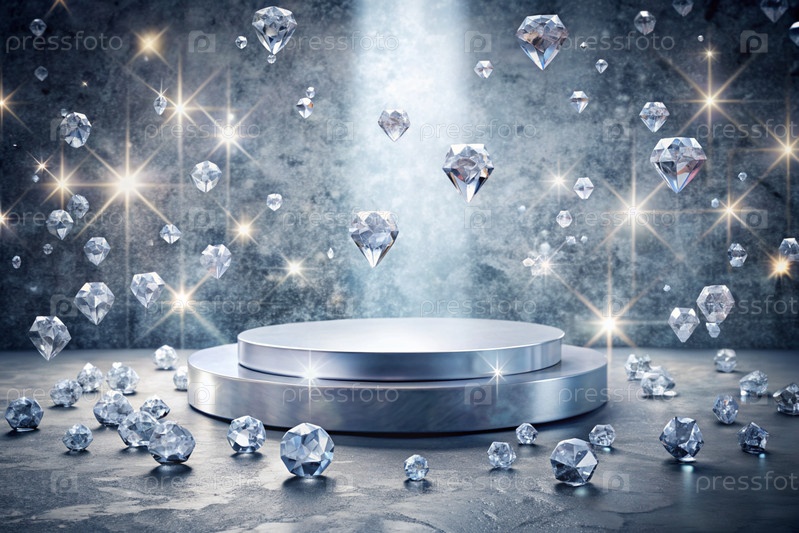 Минималистский фон для выставки ювелирных изделий. Современный пустой подиум с серой стеной и бриллиантами. Креативный дизайн презентации продукта