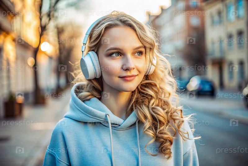 Молодая красивая кудрявая женщина слушает музыку с наушниками на вечерней улице города при закате солнца.Мир, гармония, отдых и расслабление