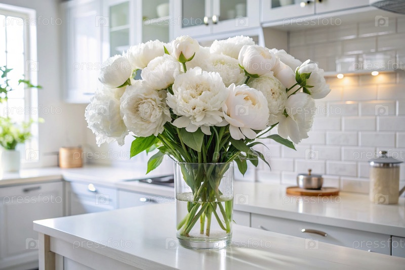 Красивый белый букет пион на золотой подносе на столе.На заднем плане интерьер современной белой кухни в скандинавском стиле.Концепция домашнего комфорта