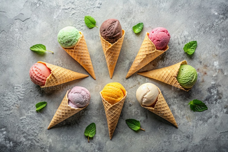 сладкий десерт. морозильные шишки с различными вкусами на бетонном сером фоне. Всемирный день мороженого