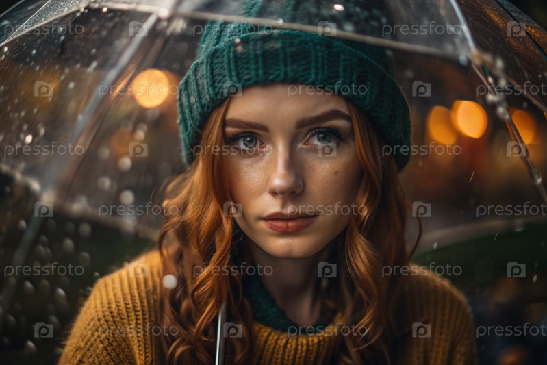 Осенний портрет под дождем. Близкий план молодой рыжеволосой женщины с ярко выраженными зелеными глазами в вязанной шляпе под зонтиком