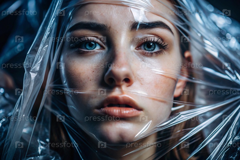 Девочка завернута в целлофан или сумку. Девушка задыхается. Пластиковое загрязнение планеты. Опасность для окружающей среды. Сокращение повторного использования пластика. Переработка. Концепция мусора