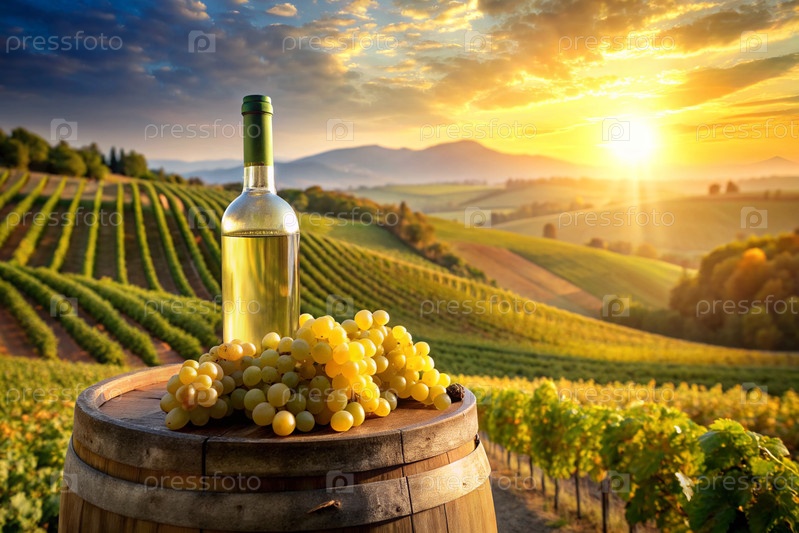 Бутылка белого вина и куча спелых виноград на деревянной дубовой бочке на фоне виноградника