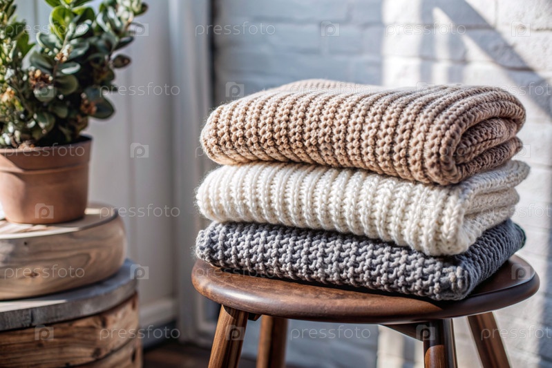 Близко, вяжу тёплую одежду на деревянном стуле в комнате.Зимний сезон, малый бизнес, ручная одежда