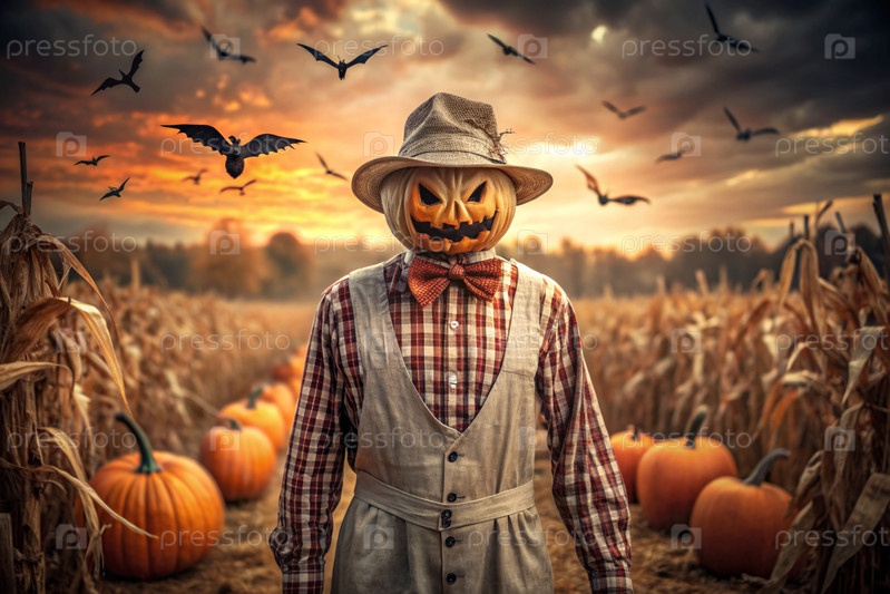 Концепция Хэллоуина. Ужасная. Страх. Устрашающий богий с тыквенной головой, квадратной рубашкой и бабочкой. Баннер, открытка