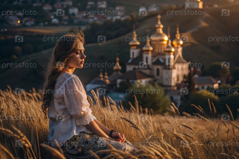 Молодая девушка в льняном платье на фоне поля спелых золотых пшениц и православной церкви при закате солнца