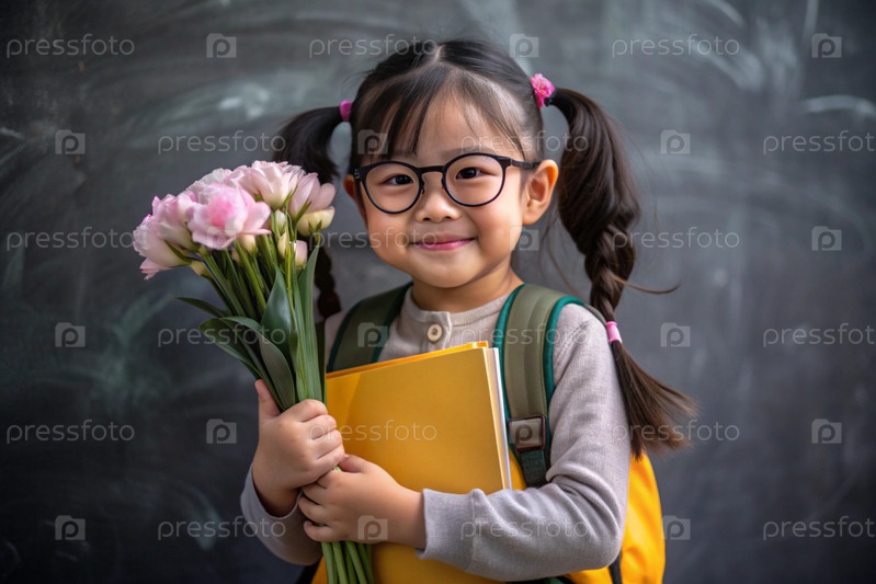 Первоклассный азиат с очками на доске. Девушка держит цветы в руках. Ребенок пойдет в школу впервые. Ребёнок с рюкзаком, книгой и цветами. Возвращение к школе