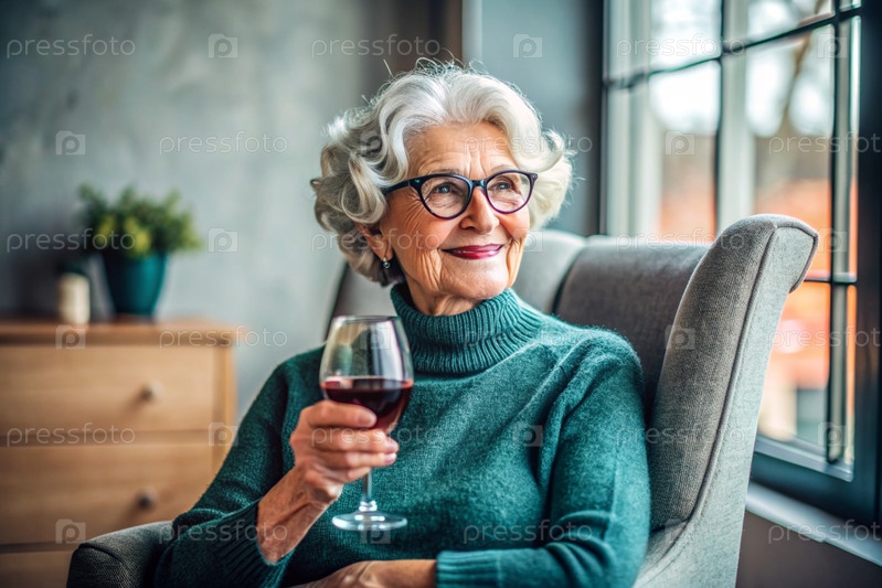 Современная, стильная пожилая женщина с короткими волосами со стаканом красного вина на стуле в гостиной дома