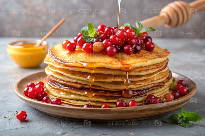 Вкусные блины с медом, ягодами, чернилами, клюквами и малиной.Концепция российского праздника Масленица