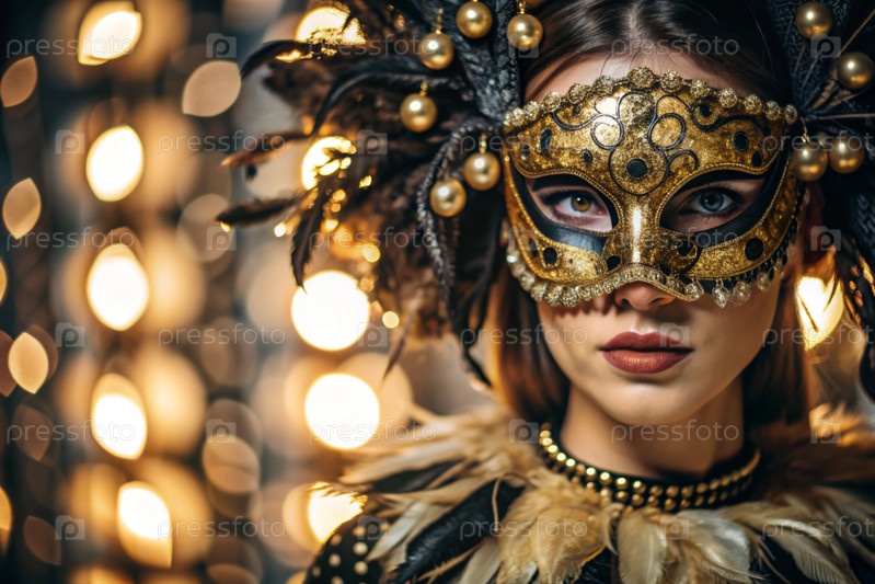 Карнавал Венеции.Закрытие женщины в украшенной карнавальной маске.Яркие цвета передают атмосферу празднования и роскоши
