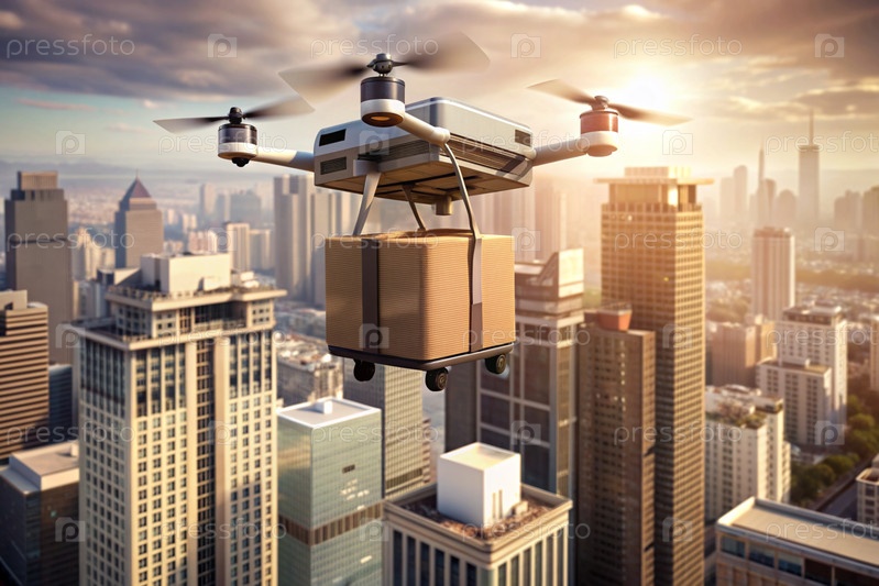 Технология будущего. Дрон доставки несет картонную коробку для человека на веревке. Дрон доставки летает между современными небоскребами. Концепция развития доставки товаров