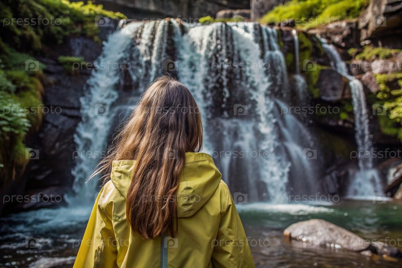 Женщина в резиновом плаще среди огромного голубого водопада. она путешествует и наслаждается жизнью и окружающей средой. туризм