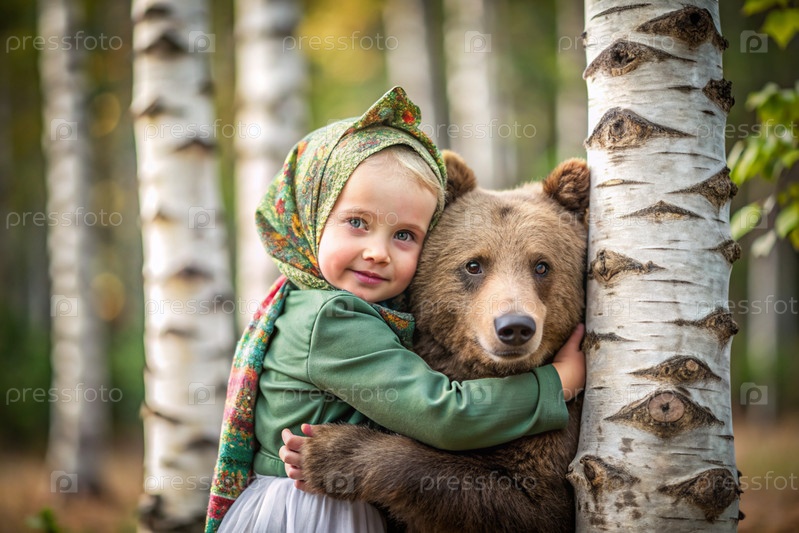 Красивая маленькая девочка в русской народной одежде и с платками на голове в березовой роще с живым медведем Русский фольклор, славянская мифология