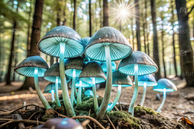 Ядовитые грибы. Жабы. Галлюциногенные грибы. Светящиеся грибы. Изображение для иллюстрации тем, связанных с природой, фантазией, сказками и магией