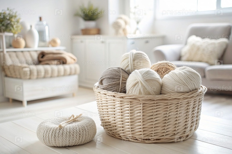 шарики пряжи в корзине из плесеня в белых и бежевых тонах швейная работа, текстиль, вязание зимний сезон, малый бизнес, ручная одежда