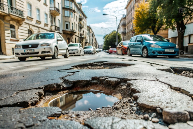 Ужасное состояние дорог. дыра в асфальте на городской улице. ремонт дороги. городская улица плохого качества