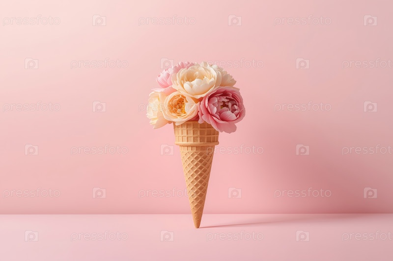 Минимальная студийная фотография. Вафельный конус. Наполненный тонкими пастельными цветами, напоминающими пионы или розы, с многослойными лепестками в мягких розовых и персиковых оттенках на розовом фоне