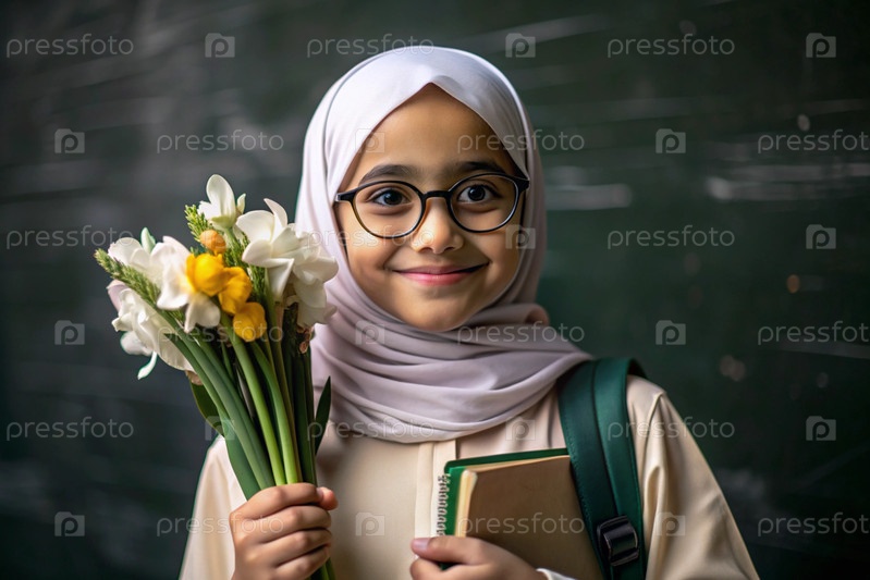 Первоклассник-мусульманин с очками на доске. Девушка держит цветы в руках. Ребенок пойдет в школу впервые. Ребёнок с рюкзаком, книгой и цветами. Возвращение к школе