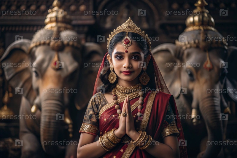 Красивая индийская девушка в традиционном национальном костюме, сари. со слонами. портрет символизирует традиции, культуру и красоту народа Индии
