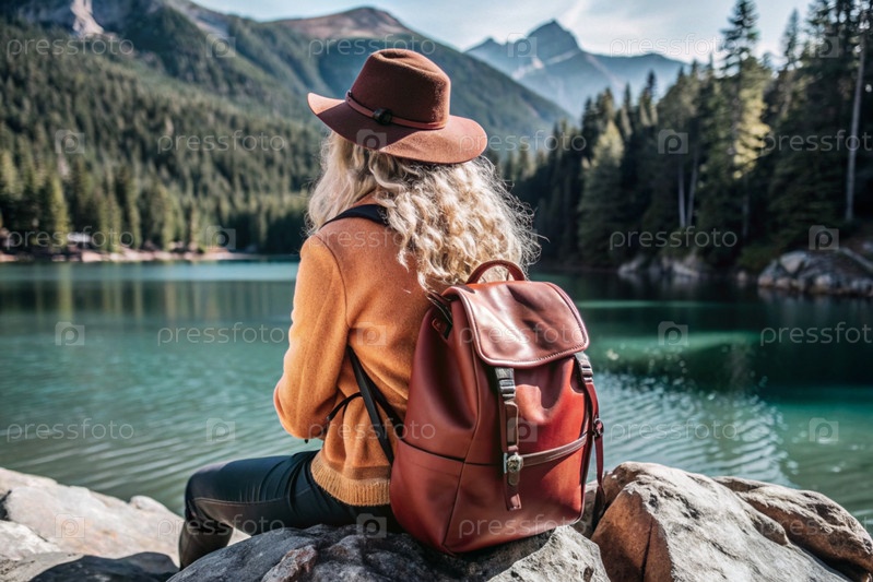 Женщина с кудрявыми светлыми волосами сидит на скале со рюкзаком на спине среди живописного озера и гор