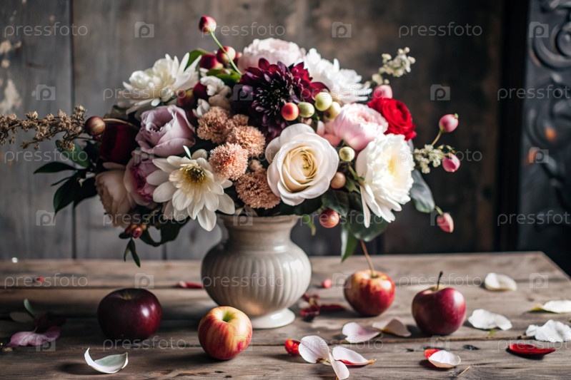 Красочное лето, осенний букет цветов различных красных, розовых, белых оттенков в вазе и спелые красные яблоки на столе