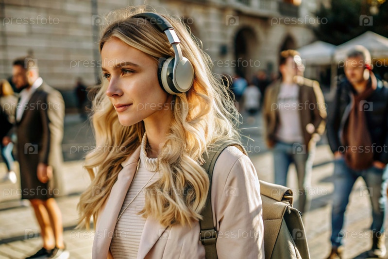 Музыкальный любитель. молодая красивая кудрявая женщина с рюкзаком на фоне улицы и людей. Турист слушает музыку в наушниках и гуляет по городу