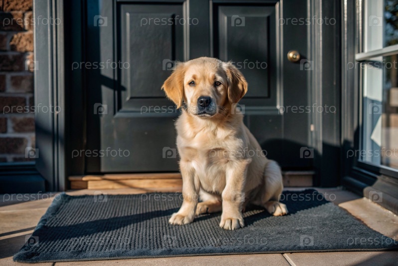 Щенок терпеливо сидит у входной двери, с нетерпением ждет своего хозяина и гуляет вместе с ним