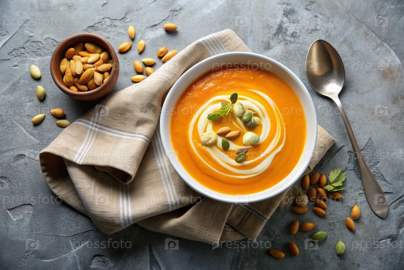 Традиционный мягкий тыквенный кремовый суп с сливками и семьями тыквы на сером бетонном фоне