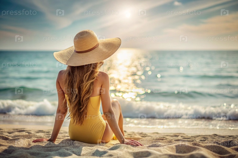 Женщина на отдыхе, сидящая в купальнике и соломенной шляпе с широкими краями на пляже в солнечный день и смотрящая на море
