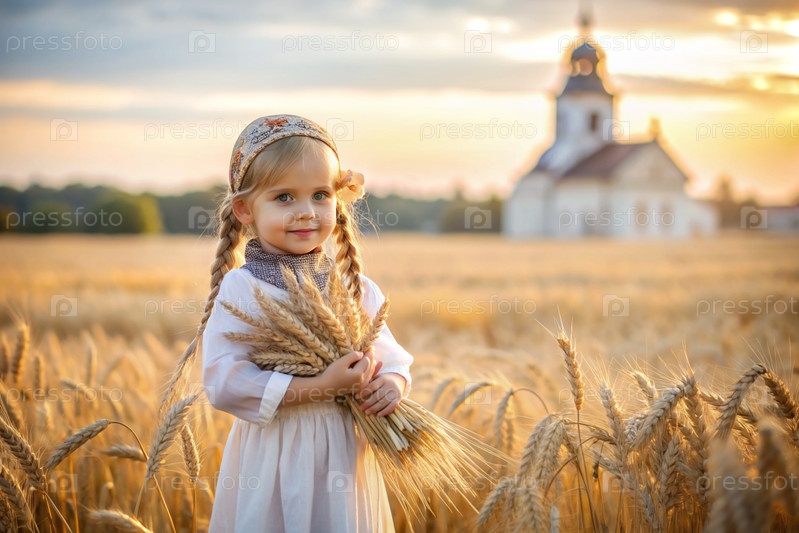 Русская девушка в белом платье и русском полотенце держит золотые колосья пшеницы на фоне созревающего поля и православной церкви