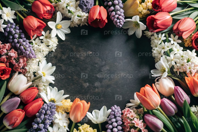 Красивый цветочный фон. Рама весенних цветков с тюльпанами, нарциссами, крокусами, гиацинтами. Вид сверху. Пространство для текста
