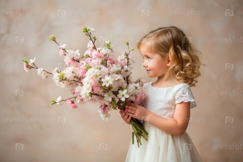 Портрет красивой кудрявой девушки с букетом вишневых цветов. ребенок позирует и смотрит в камеру