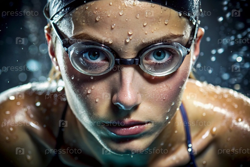 Спортивное плавание. Женское плавание. Спортсменка, которая носит очки для плавания в бассейне во время соревнований на близком расстоянии. Женщина смотрит прямо в камеру