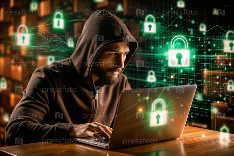 Хакер работает на ноутбуке, цифровые коды на виртуальном фоне. взлом и защита онлайн-данных. цифровые технологии, разработка программного обеспечения