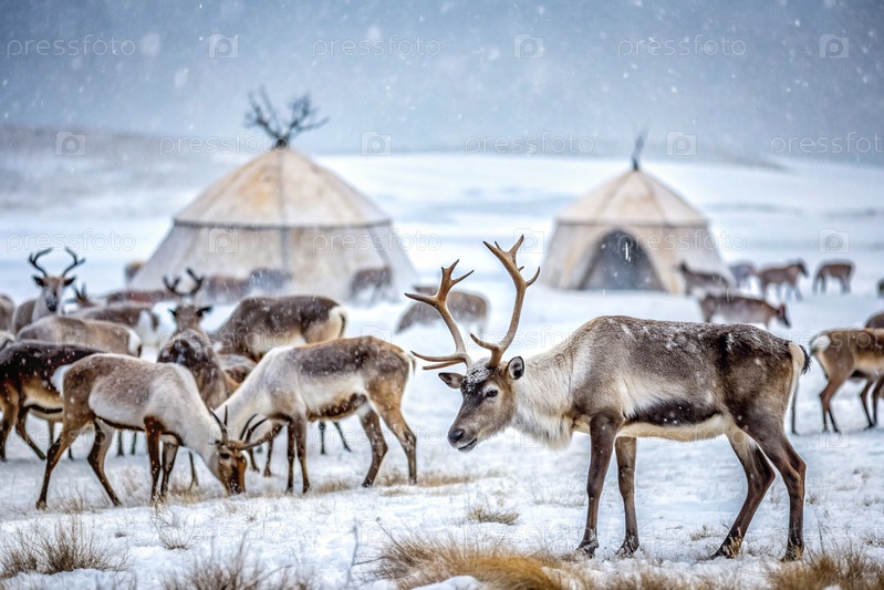 Олени пасутся против тундрового ландшафта и зимней юрты