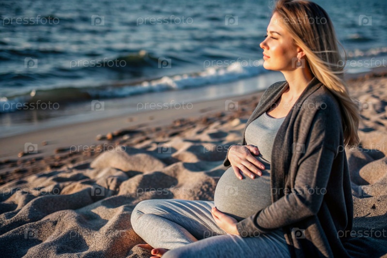 Расслабление, спокойствие, морской воздух. Закрытие живота. Беременная женщина на пляже у моря. Концепция беременности, родов и родительских обязанностей