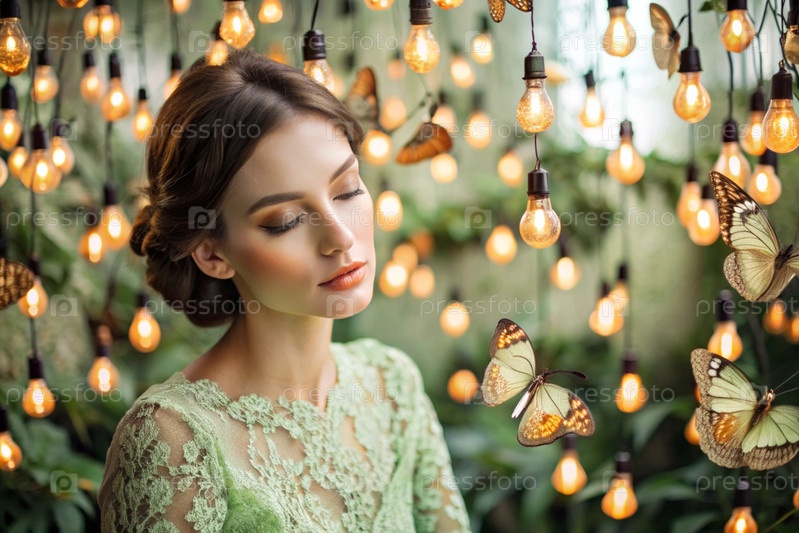 Портрет красивой девушки в зеленом платье среди многих подвешенных лампочек и бабочек, размахивающих вокруг нее