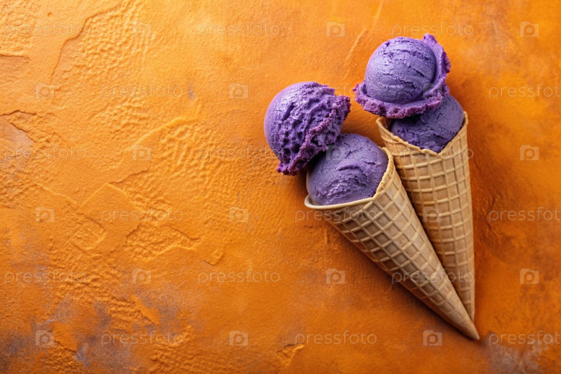 Сладкий десерт. Стильная современная концепция. Фиолетовый конус мороженого на ярко-оранжевом фоне. Всемирный день мороженого