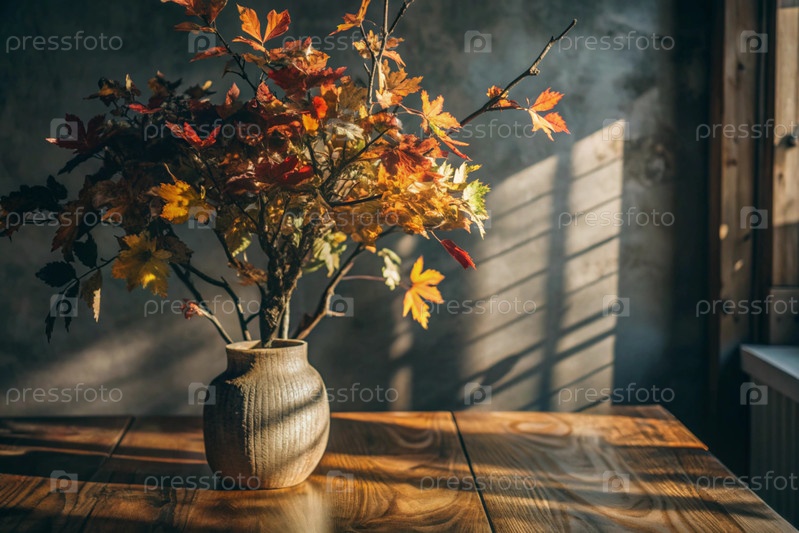 Ветви с золотыми осенними листьями в керамической вазе на деревянном столе у окна. Концепция домашнего комфорта. Осенний декор для Хэллоуина