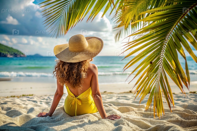 Женщина на отдыхе, сидящая в купальнике и соломенной шляпе с широкими краями на пляже в солнечный день и смотрящая на море