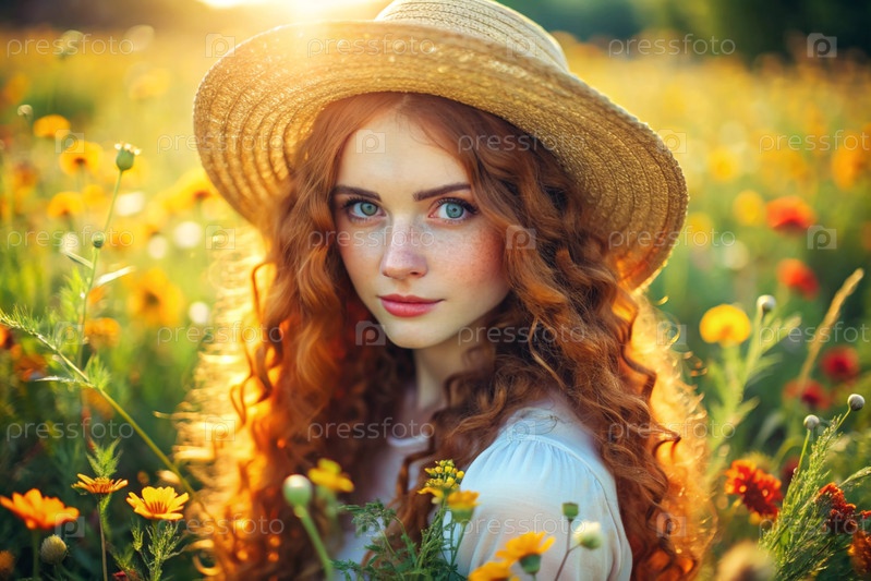 Портрет красивой кудрявой девушки в соломенной шляпе на цветочном поле.Девушка позирует и смотрит в камеру