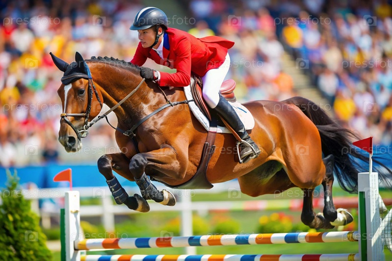 Близкий план олимпийской лошади и всадника, перепрыгивающих через препятствие на открытой арене - это конная езда