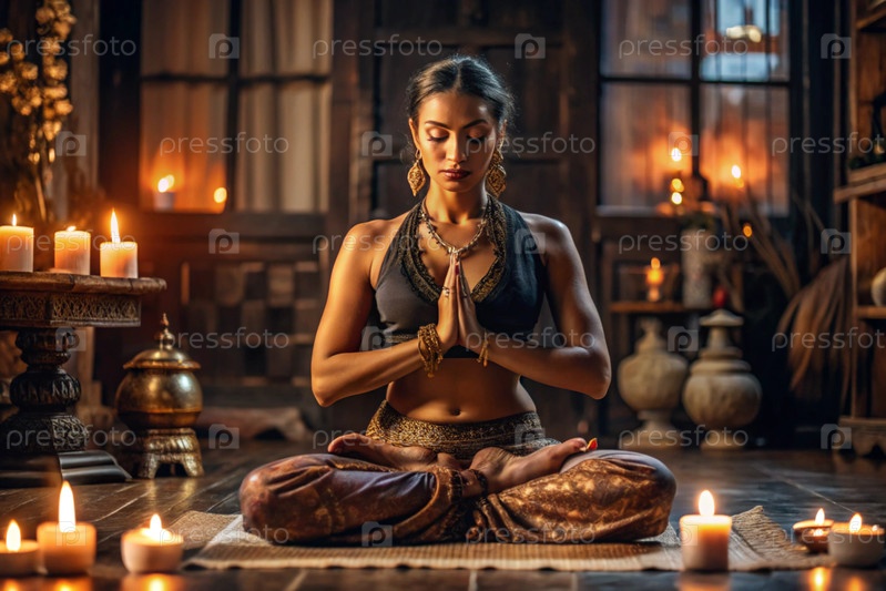 Концепция эзотерической духовной медитации, женщина в позе лотоса.Человеческая медитация, духовность и активация чакр, мистический дух