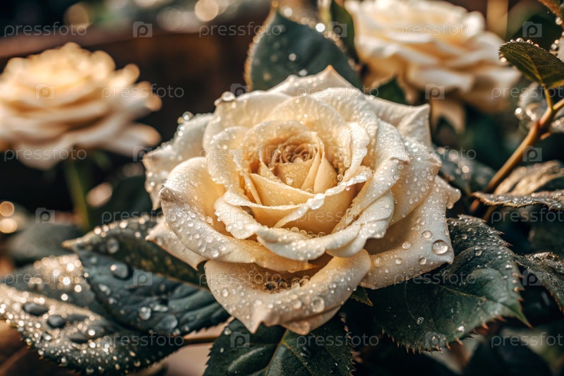 Кремовая роза красивого цвета кофе или шампанского, покрытая росой на рассвете. Красивое солнечное сияние. Фон изображения выполнен в зеленых и бежевых тонах. Естественный, экологически чистый естественный фон